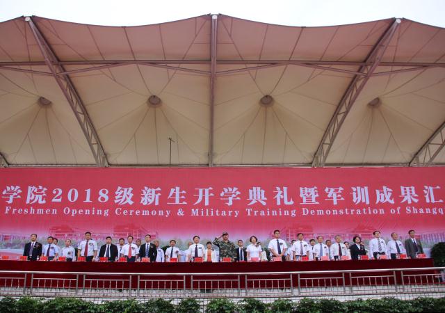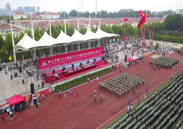 9月14日上午,金年会金字招牌2018级新生开学典礼暨军训成果汇报大会在田径场举行。校长、党委副书记程印学,副校长单伟龙,河南省武警总队少校张振江,各二级学院院长、各行政处室(中心)负责人及各二级学院党总支书记、副书记出席大会,全体承训教官、新生辅导员及全体新生参加大会。大会由单伟龙主持。