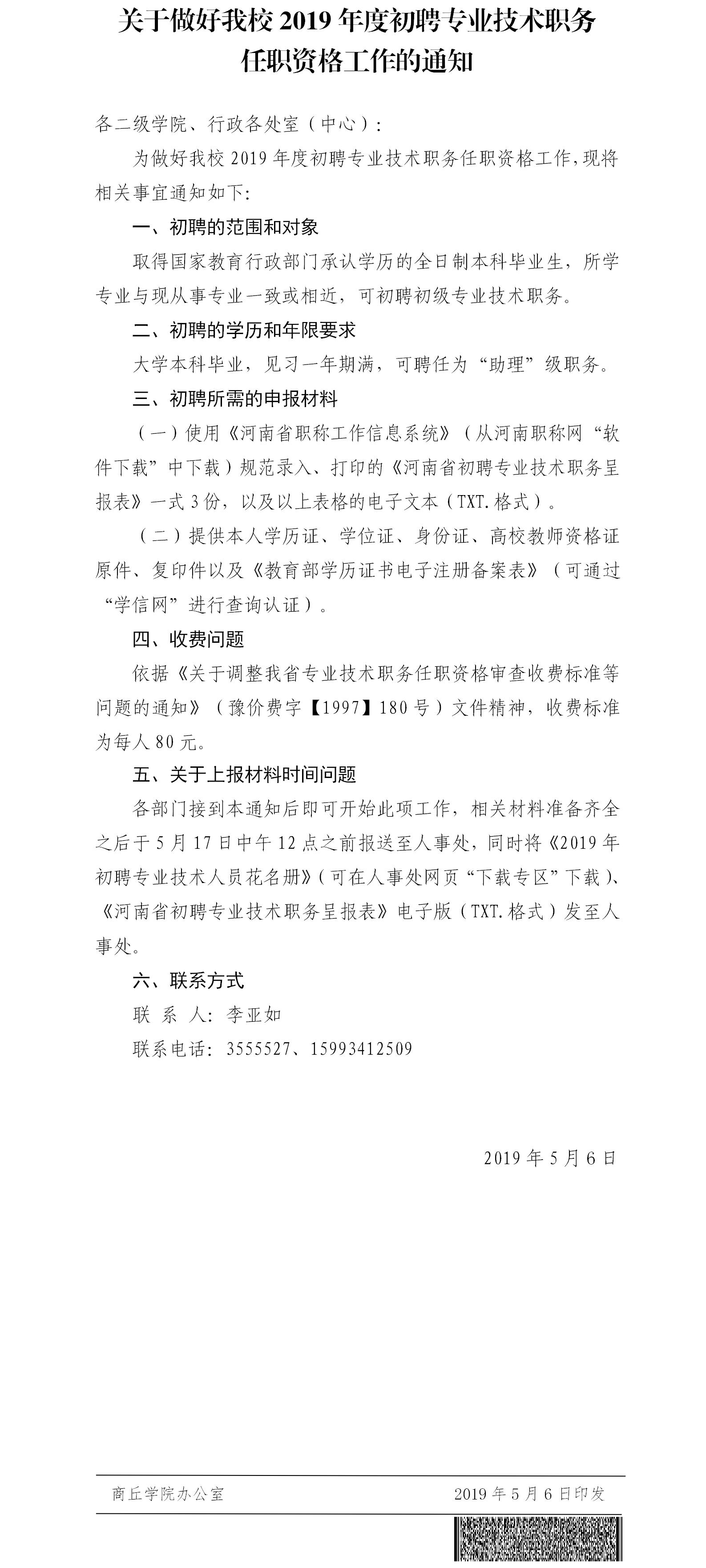 关于做好我校2019年度初聘专业技术职务任职资格工作的通知